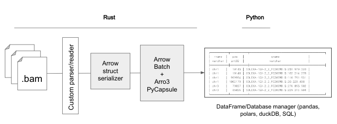 To explore this potential, I worked on implementing zero-copy base data transitions between Rust and Python to enhance bioframe operations. The initial focus was on BAM file operations using the oxbow project as a starting point following this schema: